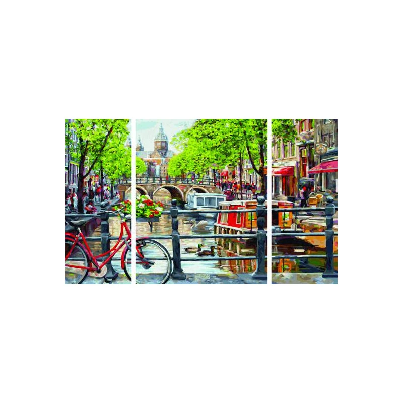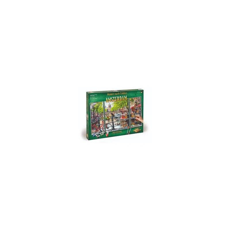 3 stukken stevig schilderkarton met linnenstructuur. Middenafbeelding 40 x 50 cm Zijafbeeldingen elk 20 x 50 cm. Exacte contourtekeningen met goed leesbare getallen. Acrylverf op waterbasis in verschillende kleuren. Verf mengen niet nodig. Fijne schilderspenseel. Controleblad en uitvoerige instructies voor succesvol schilderen.
