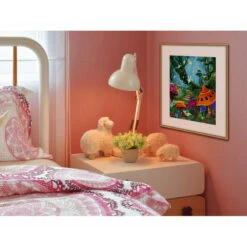 Een slingerend pad met kleurrijke paddenstoelen dat zijn weg vindt tussen bloemen en onder bomen leidt ons het magische bos in. De paddenstoelen in hun felle kleuren en de wezens die heen en weer vliegen zijn bij ons voor gezelschap. Kind of volwassene, deze mystieke kijk betovert de kijkers en nodigt uit tot dromen.