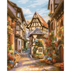 De vakwerkhuizen met florale decoraties langs een smal kronkelend laantje stralen rust en veiligheid uit. De warme kleuren benadrukken deze rustige zomeridylle, die helpt bij het creëren van een positieve stemming en aanmoedigt om te dromen terwijl je ernaar kijkt. Dit motief prikkelt de amateurschilder tot een inspirerend artistiek onderzoek naar de bijzondere charme en het karakter van een dorp waar de tijd lijkt stil te staan.