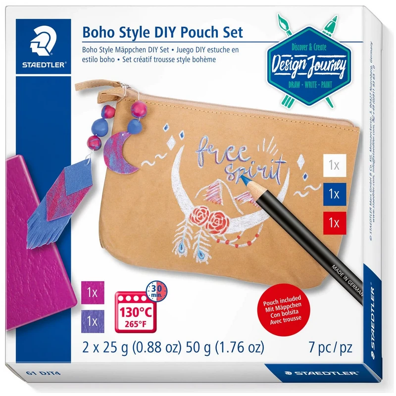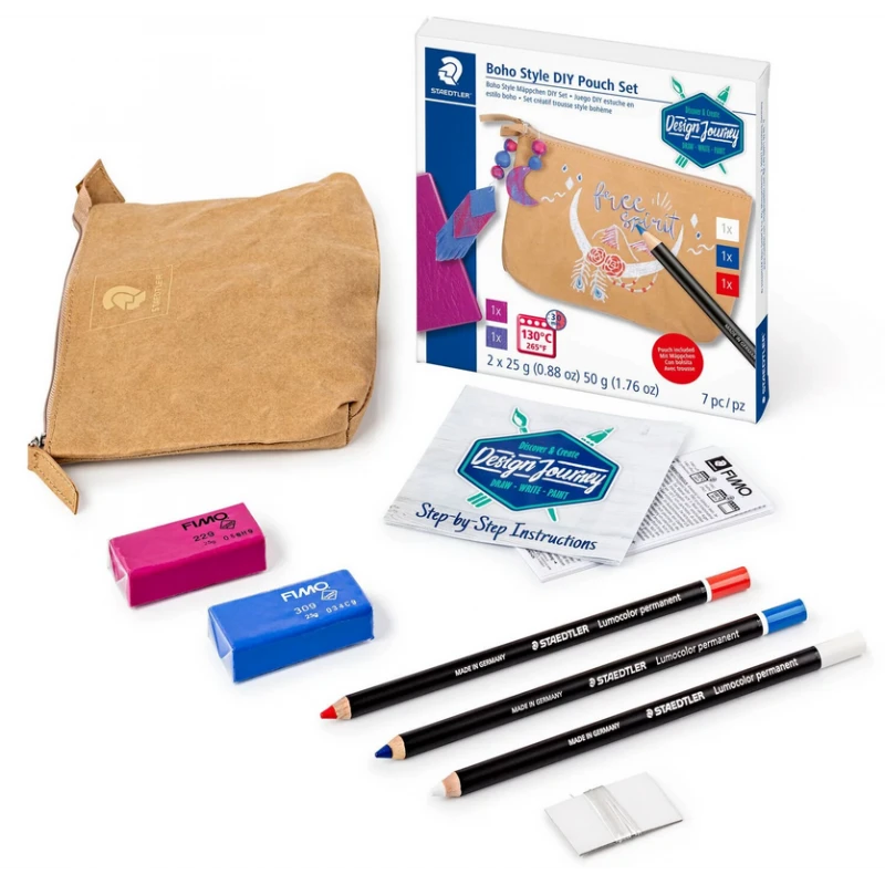 In deze 7-delige set vind je alles voor het decoreren van een etui in trendy Boho stijl. De meegeleverde etui van kraft paper is perfect om te decoreren met de permanente kleurpotloden en de Fimo leather klei. Voor zowel beginners als hobbykunstenaars. Bevat 1 etui, 3 kleurpotloden permanent, 2 kleuren Fimo leather klei en 1 elastiek. Fimo leather klei wordt net zoals gewone Fimo in de oven gebakken (30 minuten op 130 graden), maar voelt daarna aan als kunstleer. Ook kun je dit knippen, naaien en plakken. Inclusief stap-voor-stap foto-instructie