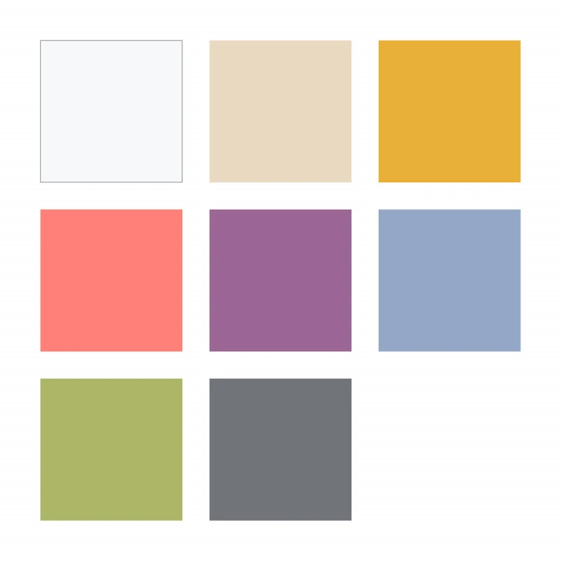 Kleuren: 0 wit, 70 sahara, T10 Mango, T20 Grapefruit, T30 Ochtendbries, T50 Pistachenoot, T60 Bosbessen & T80 Grijs.