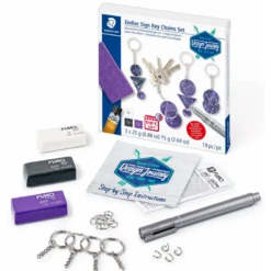 Deze Zodiac sign key chains set is samengesteld voor het maken van leuke sleutelhangers met sterrenbeelden erop. De sleutelhangers maak je van ovenhardende boetseerklei (Fimo klei). Geschikt voor beginners en hobby kunstenaars. Bevat 3 kleuren Fimo klei, 1 tube glans vernis, 1 metallic marker, 4 sleutelringen en 10 buigringen. De klei dien je 30 minuten op 110 graden af te bakken in de keukenoven. Een instructie is ingesloten.