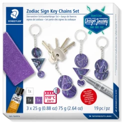 Deze Zodiac sign key chains set is samengesteld voor het maken van leuke sleutelhangers met sterrenbeelden erop. De sleutelhangers maak je van ovenhardende boetseerklei (Fimo klei). Geschikt voor beginners en hobby kunstenaars. Bevat 3 kleuren Fimo klei, 1 tube glans vernis, 1 metallic marker, 4 sleutelringen en 10 buigringen. De klei dien je 30 minuten op 110 graden af te bakken in de keukenoven. Een instructie is ingesloten.