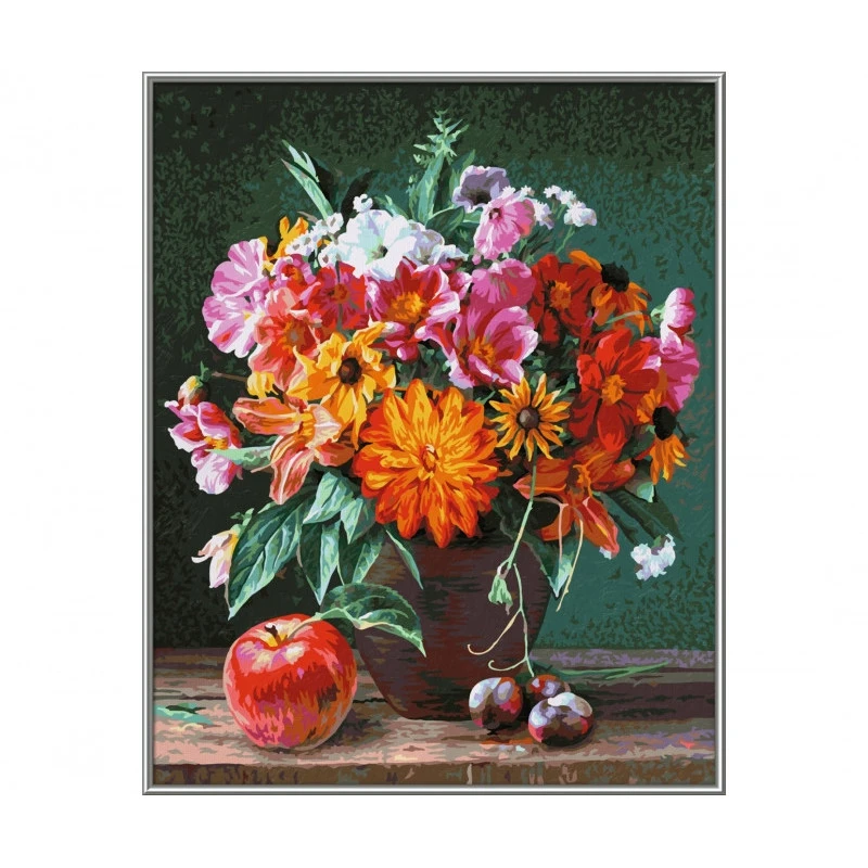 Al de pracht van de nazomer straalt met oplichtende kleuren in dit herfstboeket en brengt de laatste beloften van het tuinjaar in huis. Het intensieve kleurenpalet reikt van het tere wit van de petunia’s via het stralende roze van de malve en het felle oranje van de daglelies en dahlia’s tot en met het diepe robijnrood van de zinnia’s, en schenkt de toeschouwer een imposante groet uit de landelijke tuin. De hobbyschilder ontspant als hij dit motief in warme herfsttinten schildert.
