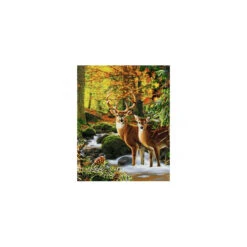 Trots staat het edelhert in het herfstbos naast zijn hinde in het ondiepe water van het beekje. Het lijkt wel of hij tegen de toeschouwer wil zeggen: “Dit is onze plek, het bos en de natuur zijn van ons. Je mag naar ons kijken, maar vergeet niet dat je hier slechts te gast bent.” Een schitterend natuurmoment in ons land, vastgelegd in prachtige tinten groen en bruin. Een motief voor de natuurvriend en hobbyschilder.