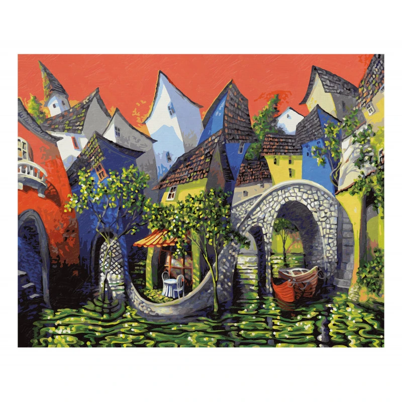 Door de artistieke mix van kleuren en vormen creëert Miguel Freitas een prachtig en fantasierijk uitzicht op een klein stadje aan het meer. In het midden bevindt zich de brug met zijn dramatische vormen, geflankeerd door het groenige glinsterende water en de dynamische huizen die in gedempte kleuren de lucht in schieten. Het warme rood van de lucht vormt een aanvulling op deze droomachtige scène en roept vakantieherinneringen uit het verleden op. De overvloed aan vormen en vormen is pure verleiding voor de hobbyschilder.