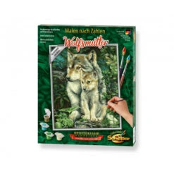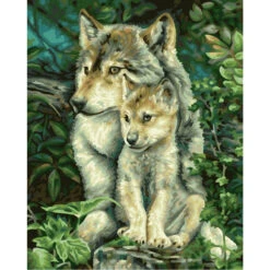 Wolven hebben de mensen altijd al gefascineerd, maar ook angst aangejaagd. Deze charismatische roofdieren staan onder speciale bescherming nadat zij in vele gebieden van Europa waren uitgeroeid. Wolven hebben een sterke gemeenschaps- en familiezin. Dankzij deze sociale verbondenheid zijn zij succesvolle jagers en kunnen goed voor hun nageslacht zorgen. De moederwolf heeft binnen het roedel wolven een vooraanstaande positie. Het beeldmotief toont de zorgende moederwolf met waakzame blik, waar het jong zich tegenaan vlijt. De opstelling van de afbeelding accentueert de hechte band van het jong en het moederdier en maakt deze verbintenis voor het hobbyschilderen zintuiglijk beleefbaar.