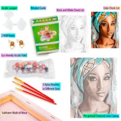 Verf: Acrylverf op waterbasis in vacuümverpakking om uitdrogen te voorkomen. De verven zijn voorverpakt in plastic potjes welke geseald zijn. Het nummer op de potjes komt overeen met het nummer op het canvas. Tevens bevat het pakket 2 potjes Acryl-lak om de kleur te versterken en de verf te beschermen. De geleverde verf is gifvrij en met water te verdunnen. De meegeleverde ophang haakjes maken het compleet zodat het geschilderde kunstwerk zonder extra kosten kan worden opgehangen.
