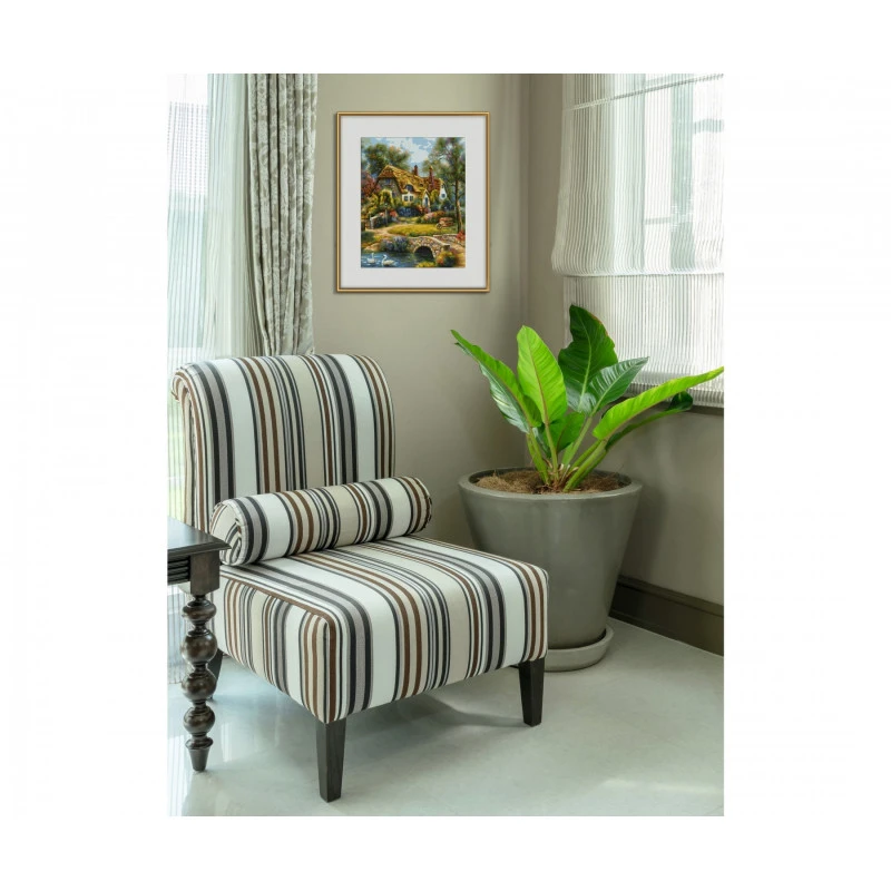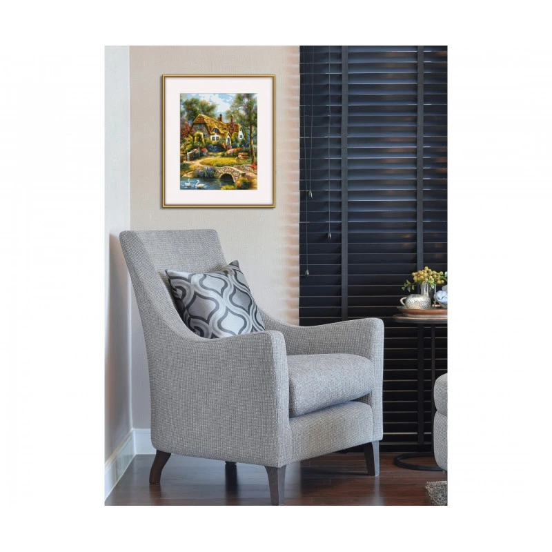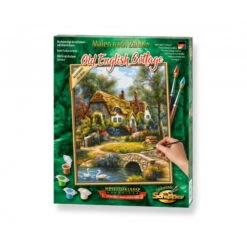 Een dromerig oud Engels landhuis, omgeven door een weelderige tuin. Op de voorgrond een stenen bruggetje over een beek waarin twee zwanen zwemmen. Een echte idylle, die door het licht van de herfstzon in warme kleuren wordt gedompeld. Een sfeervol motief, dat rust en geborgenheid uitstraalt en uitnodigt tot hobbyschilderen.