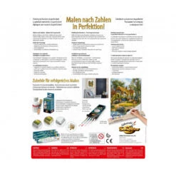 Stevig schilderkarton met linnenstructuur 24 x 30 cm. Exacte contourtekeningen met goed leesbare getallen. Acrylverf op waterbasis in verschillende kleuren. Verf mengen niet nodig. Fijne schilderspenseel. Controleblad en uitvoerige instructies voor succesvol schilderen.
