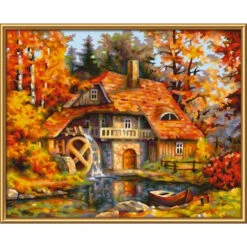 Door de laagstaande zon straalt de oude watermolen in de warme kleuren van de herfst. De gloeiend goudgele en roodbruine bladeren van de loofbomen spiegelen in de langsstromende beek. Het door het water aangedreven schoepenwiel en het bootje aan de oever van de beek benadrukken de stemmige compositie van het schilderij. Het geeft een gevoel van geborgenheid en inspireert je tot dromen – alsof de tijd heeft stilgestaan.