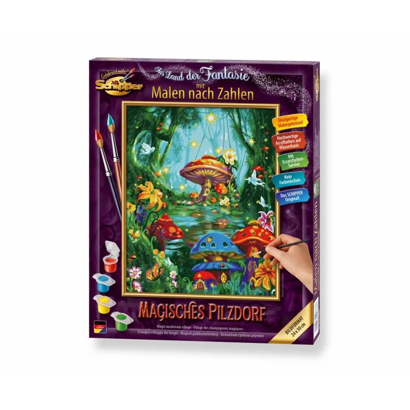 Stevig schilderkarton met linnenstructuur 24 x 30 cm. Exacte contourtekeningen met goed leesbare getallen. Acrylverf op waterbasis in verschillende kleuren. Verf mengen niet nodig. Fijne schilderspenseel. Controleblad en uitvoerige instructies voor succesvol schilderen.