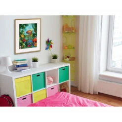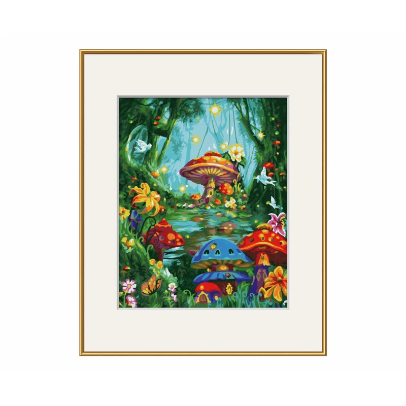 Kleurrijke paddenstoelen blijven uit de grond springen om een kleiner waterlichaam in het bos te omringen. Als je beter kijkt, zie je de ramen en deuren in de paddenstoelen. Wie kan hier wonen? De heldere en vrolijke kleuren en vormen van de paddenstoelen langs het water behagen de kijkers en nodigen hen uit voor een fantastische reis.
