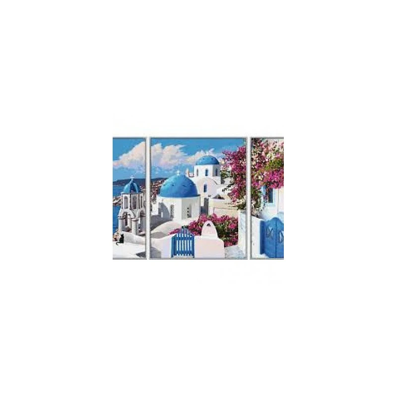 Het blinkende wit van de huizen met de stralend blauwe koepels, de poortjes en ramen betovert iedereen die het ziet en ontvoert hem naar de paradijselijke wereld van de Griekse Cycladeneilanden. Je blik gaat over het heldere water naar de verte, met de geur van bougainville in je neus en het lichte briesje van de zee in je haar. Dat is Santorini van zijn mooiste kant. Een eiland in blauw en wit. Met dit motief haalt de hobbyschilder de schoonheid van de zuidelijke Egeïsche Zee in huis. Beeldformaat en schildervoorbeeld: