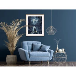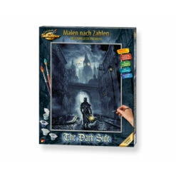 “The dark side” vangt op mystieke wijze de sfeer van het nachtelijke landschap en laat veel ruimte voor speculatie: waarom dwaalt een man eenzaam door de donkere steegjes en de pikdonkere nacht? Waar wil hij heen? Heeft hij iets te doen? verstoppen?Wat is zijn plan?Laat je fantasie de vrije loop tijdens het schilderen en het bekijken van de afbeelding.