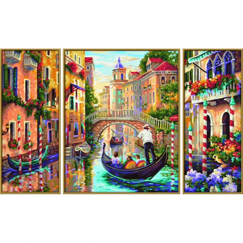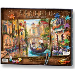 Ontspannend vaart de gondolier zacht schommelend door de schilderachtige steegjes van de romantische stad, die als een drijvend eiland op water gebouwd lijkt te zijn. Met de pittoreske villa’s en paleizen weet “Venezia” iedere bezoeker te fascineren en leidt iedereen met veel charme de glamoureuze tijd van de oude handelsstad en pasgetrouwde paartjes de zevende hemel in. De hobbyschilder geniet letterlijk van de Venetiaanse levensstijl terwijl hij dit schilderij maakt.