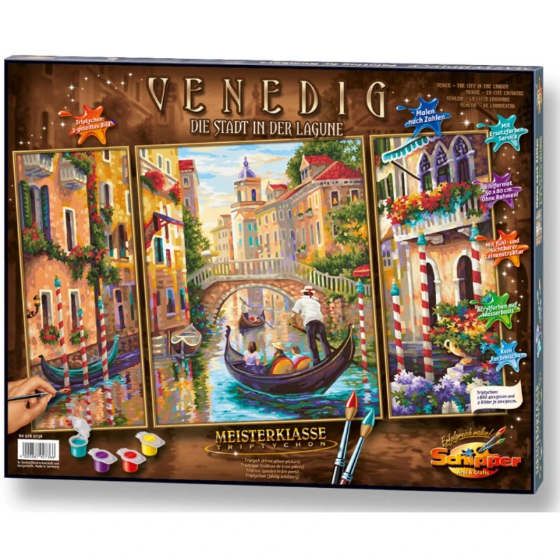 3 stukken stevig schilderkarton met linnenstructuur. Middenafbeelding 40 x 50 cm Zijafbeeldingen elk 20 x 50 cm. Exacte contourtekeningen met goed leesbare getallen. Acrylverf op waterbasis in verschillende kleuren. Verf mengen niet nodig. Fijne schilderspenseel. Controleblad en uitvoerige instructies voor succesvol schilderen. Wordt geleverd exclusief lijst.
