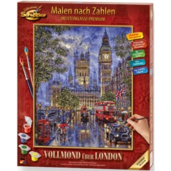 De Houses of Parliament met de beroemde Big Ben staan als geen ander gebouw voor de kosmopolitische stad Londen. De avondsfeer met rode dubbeldekkerbussen en typisch Engelse taxi’s op een glinsterende, regenachtige straat geven het beeld uitstraling en diepte. De subtiel verlichte oriëntatiepunten van de metropool – maar ook de maan die aan de bewolkte hemel verschijnt – onderstrepen de bijzondere magie die uitgaat van deze buitengewone stad. Dit motief blijkt dus een schitterend kunstwerk te zijn voor de hobbyschilderkunst en tegelijkertijd een hommage aan Londen.